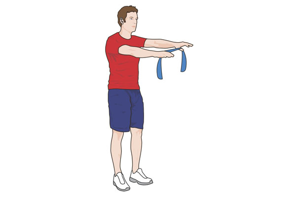 Hunched over, shoulders pulled forward, staring at your iPhone or computer screen all day? This anterior dominance plays havoc with your shoulders and back, and can manifest itself as soreness in the shoulder blades, rear shoulder, upper back areas. This exercise is so simple but so effective at sorting out this imbalance. It is also a good warm up for any upper body exercise: hold an exercise band in front of you with outstretched arms, arms straight with elbows locked. Pull the band apart, palms facing down, arms stretched outside of shoulder width, but elbows remain locked out and hold tension in the band for 10secs. Keeping tension, raise the arms higher so now at eye level. Keep tension for another 10secs. Now try and raise them even higher to just above head height, without arching your back. Hold for another 10secs. Now lower and hold at each of the previous positions. The total time will be 50secs for five positions of tension and result in a back and shoulders that are woken from their hunched slumber. Palms facing down, pull band apart so it is stretched outside of shoulder width, but elbows remain locked out.