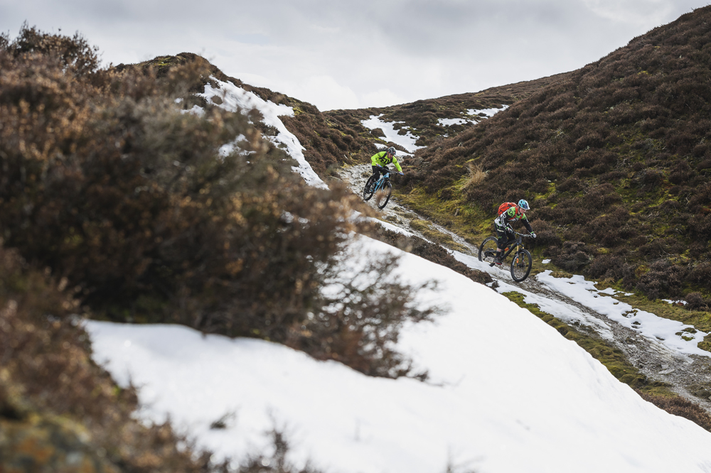 We’ve not seen another soul on the ride. The only vehicles we’ve seen have been a car, long abandoned in a pool of water and a tractor equipped with a second set of tyres parked in the middle of nowhere. Tyre tracks through the snow show we’re not the only ones to have travelled this way though. In a cruel twist the final descent is on sodden close-cropped grass, potentially our mud-free ride will be undone at the last few turns. That golf green grass mixed with water is slick, sending wheels sideways on turns and immune to attempts to lose any speed. At the bottom of the trail we’re not dirtier than the top but quite a bit wetter. Success! We get back to Dales Bike Centre just as Stu is closing up so miss out on their famous selection of cakes. We hose down the bikes, more out of habit than because they need it.